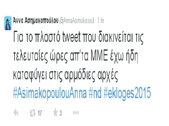 Η Ασημακοπούλου ανακοίνωσε ότι έχει ενημερώσει τις αρμόδιες αρχές για το πλαστό tweet μέσω του λογαριασμού της στο Twitter: