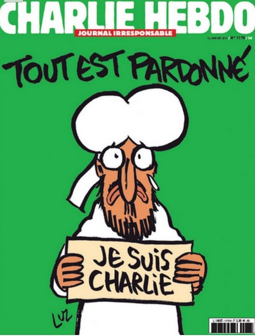 Απεικονίζεται ο Μωάμεθ κρατώντας ένα πλακάτ που αναφέρει «Je Suis Charlie» και γενικό τίτλο «Τα πάντα συγχωρούνται».