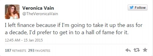 «Άφησα μια δουλειά στη Wall Street για μια καριέρα στο πορνό γιατί δεν μπορώ να σταματήσω να αυνανίζομαι στη δουλειά» δήλωσε η πρώην χρηματίστρια, η οποία πλέον χρησιμοποιεί το ψευδώνυμο Βερόνικα Βέιν, στον προσωπικό της λογαριασμό στο twitter.