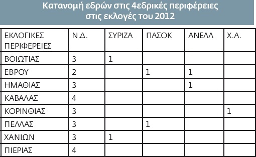 Να σημειωθεί ότι στις εκλογές του 2012, στις οκτώ 4εδρικές περιφέρειες είχαν… μοιραστεί 32 έδρες (τις 25 είχε πάρει η Ν.Δ.) ενώ τώρα με τις δέκα 4εδρικές θα μοιραστεί μεγαλύτερος αριθμός εδρών, δηλαδή 40.