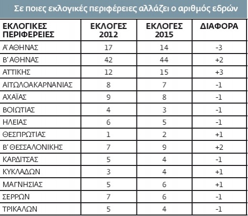 Ως γνωστόν, οι εκλογές του 2015 θα γίνουν με βάση την απογραφή του 2011 (οι εκλογές του 2012 έγιναν με την απογραφή του 2001), με συνέπεια να υπάρχει αλλαγή αριθμού εδρών σε 16 περιφέρειες, με πιο εμφατική περίπτωση την Α’ Αθήνας, η οποία χάνει τρεις έδρες! Αντίθετα, η Β’ Αθήνας και η Β’ Θεσσαλονίκης «κερδίζουν» δύο ενώ η Περιφέρεια Αττικής τρεις έδρες.