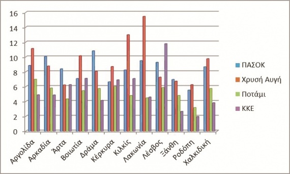 Το ΠΑΣΟΚ έδωσε στη δημοσιότητα σχετικά γραφήματα, στα οποία φαίνονται τα ποσοστά που πήραν το ΠΑΣΟΚ, η Χρυσή Αυγή, το ΚΚΕ και το Ποτάμι στις ευρωεκλογές στις τριεδρικές εκλογικές περιφέρειες (βλέπε γράφημα παραπλεύρως). Προκύπτει ότι στις 9 από τις 11 η μάχη αφορά το ΠΑΣΟΚ και τη Χρυσή Αυγή και σ’ αυτήν το ΠΑΣΟΚ θα θέσει το δίλημμα «ή εμείς ή οι χρυσαυγίτες».