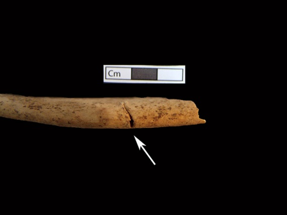 Σημειώνεται ότι ο σχετικά νεαρότερος από τους δύο άνδρες (άτομο 2) φέρει ίχνη τομών (cut marks) στην αριστερή άνω θωρακική μοίρα, σε δύο πλευρές και αυχενικό σπόνδυλο, (Εικ. 9-11) καθώς και στην κάτω επιφάνεια του στερνικού άκρου της αριστερής κλείδας. Ταυτίζονται πιθανόν με επιθετικά χτυπήματα-τραυματισμούς, που θα πρέπει να έγιναν εξ επαφής με αιχμηρό όργανο π.χ. μαχαιρίδιο, και προκάλεσαν το θάνατο του, καθώς δεν διακρίνονται ενδείξεις επούλωσης.