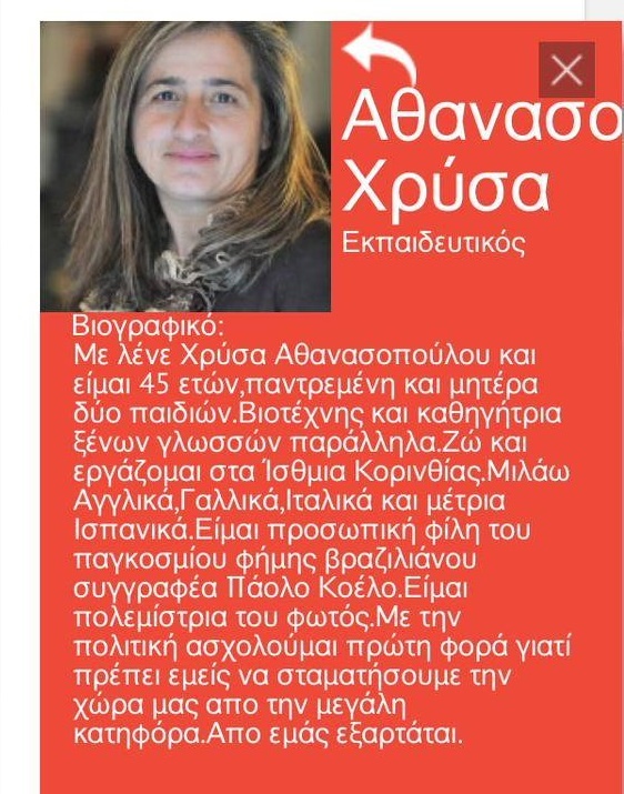 «Είμαι προσωπική φίλη του παγκοσμίου φήμης Βραζιλιάνου συγγραφέα Πάολο Κοέλο. Είμαι πολεμίστρια του φωτός» γράφει στο βιογραφικό της η υποψήφια στην Κορινθία με το Ποτάμι, Χρύσα Αθανασοπούλου.