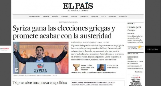El Pais: "Ο ΣΥΡΙΖΑ κέρδισε τις ελληνικές εκλογές και υπόσχεται να σταματήσει τη λιτότητα"