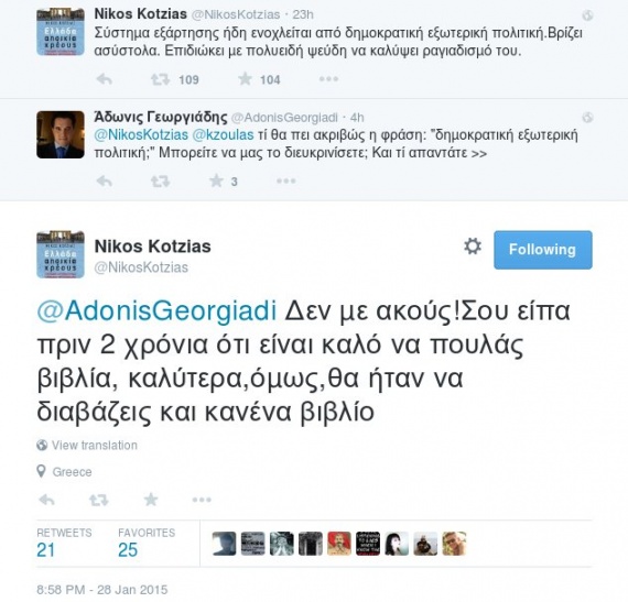 Ενώ στη συνέχεια ακολούθησαν άλλα δύο tweets του κ. Κοτζιά στα οποία όμως δεν υπήρξε απάντηση του κ. Γεωργιάδη.