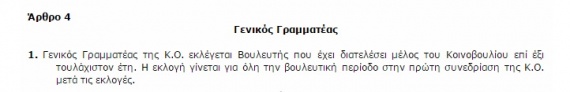 Γενικός Γραμματέας της K.O. εκλέγεται Βουλευτής που έχει διατελέσει μέλος του Κοινοβουλίου επί έξι τουλάχιστον έτη. H εκλογή γίνεται για όλη την βουλευτική περίοδο στην πρώτη συνεδρίαση της K.O. μετά τις εκλογές.