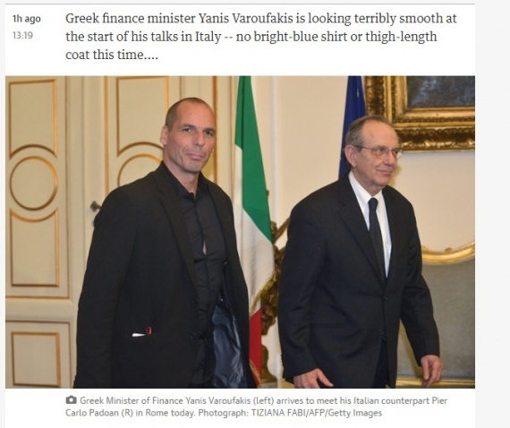 «Ο Έλληνας υπουργός Οικονομικών Γιάννης Βαρουφάκης δείχνει αφόρητα κομψός, στις πρώτες επαφές του στην Ιταλία, αυτή τη φορά χωρίς φωτεινό μπλε πουκάμισο και παλτό μέχρι το μηρό» αναφέρει ο guardian, αφήνοντας αιχμές για τις ενδυματολογικές επιλογές Βαρουφάκη στη συνάντηση του με τον Βρετανό YΠΟΙΚ.