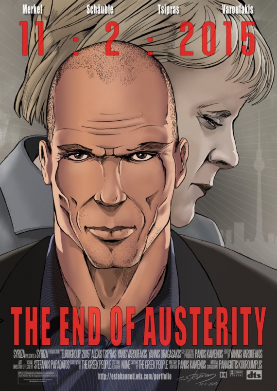 Τελευταίο ένα πόστερ σαν να επρόκειτο για ταινία, που απεικονίζει τον Γιάνη Βαρουφάκη με φόντο την καγκελάριο της Γερμανίας, την σημερινή ημερομηνία του Eurogroup και τον τίτλο: «Το τέλος της λιτότητας».