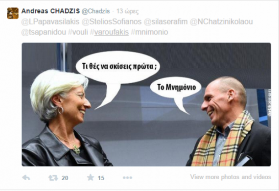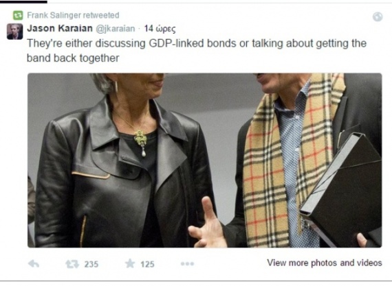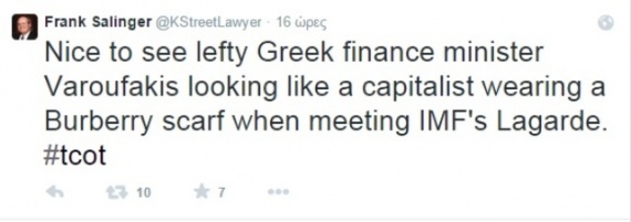 «Ωραίο να βλέπεις τον αριστερό Έλληνα υπουργό Οικονομικών ντυμένο σαν καπιταλιστή να χαιρετά την Λαγκάρντ του ΔΝΤ», σχολίασε ο Frank Salinger.