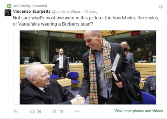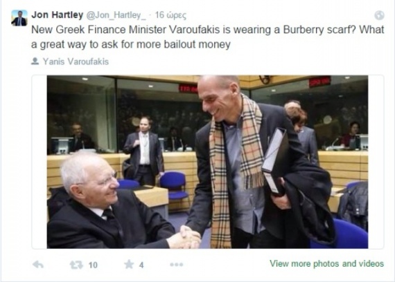 «Ο νέος υπουργός Οικονομικών Βαρουφάκης με κασκόλ Burberry; Ωραίος τρόπος για να ζητάς κι άλλο πακέτο βοηθείας», έγραψε ο Jon Hartley.