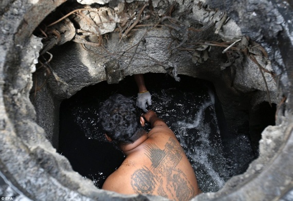 Οι ίδιοι βυθίζονται μέχρι το λαιμό μέσα στη μαύρη γλίτσα και απομακρύνουν τα λύματα κουβά – κουβά.