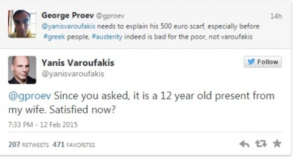 Μέσω του προσφιλούς του μέσου, του twitter, απάντησε για άλλη μια φορά, ο Γιάνης Βαρουφάκης, σε σχόλιο σχετικά με το πολυσυζητημένο Burberry κασκόλ που φορούσε στο Eurogroup.