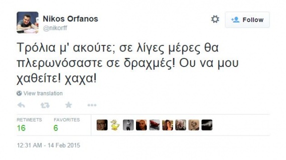 Συγκεκριμένα, απευθυνόμενος στα troll του twitter, ο ηθοποιός και νεοεκλεγείς βουλευτής με το Ποτάμι έγραψε: "Τρόλια μ' ακούτε; σε λίγες ημέρες θα πλερωνόσαστε σε δραχμές! Ου να μου χαθείτε! Χαχα"