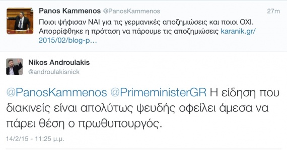 Ο Νίκος Ανδρουλάκης, απάντησε στον Πάνο Καμμένο, "Η είδηση που διακινείς είναι απολύτως ψευδής οφείλει άμεσα να πάρει θέση ο πρωθυπουργός" ενώ έκανε mention και τον επίσημο λογαριασμό του πρωθυπουργού στο Twitter.