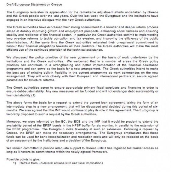 «Το Eurogroup δηλώνει την εκτίμησή του για την αξιόλογη προσπάθεια που έχει καταβάλει η Ελλάδα και ο ελληνικός λαός τα προηγούμενα χρόνια. Την προηγούμενη εβδομάδα το Eurogroup και οι θεσμοί μπήκαν σε έναν έντονο διάλογο με τις νέες ελληνικές αρχές.