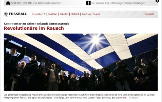 Στο δημοσίευμα με τίτλο «Επανάσταση προ των πυλών» αναφέρονται σκληροί χαρακτηρισμοί για τον Πρωθυπουργό και τον Υπουργό Οικονομικών αφού αναφέρεται χαρακτηριστικά: «Οι δύο άντρες όχι μόνο αποζητούν το φθηνό χειροκρότημα των Ελλήνων συμπατριωτών τους, επιπροσθέτως λειτουργούν σαν παίκτες του πόκερ. Που δεν μπορούν να καταλάβουν ότι με την μπλόφα τους μπορεί να τα χάσουν όλα».