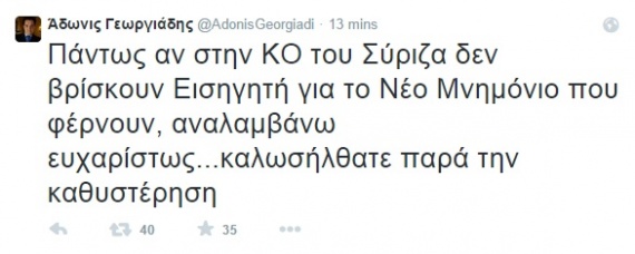 «Πάντως αν στην Κοινοβουλευτική Ομάδα του ΣΥΡΙΖΑ δεν βρίσκουν εισηγητή για το νέο μνημόνιο που φέρνουν, αναλαμβάνω ευχαρίστως… Καλωσήλθατε παρά την καθυστέρηση».