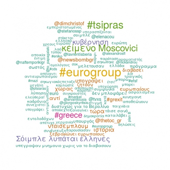 Στο διάγραμμα 1 δείχνουμε πρώτα τα πιο σημαντικά θέματα, λέξεις κλειδιά, όπως αυτά προέκυψαν από την ανάλυση των ελληνικών μηνυμάτων. Στο διάγραμμα (wordcloud) φαίνεται ποιες ήταν οι έννοιες που απασχόλησαν περισσότερο του χρήστες. Οι περισσότεροι χρήστες ασχολήθηκαν με το κείμενο Moscovici, καθώς και τη δήλωση του Σοιμπλε ότι λυπάται τους Έλληνες.