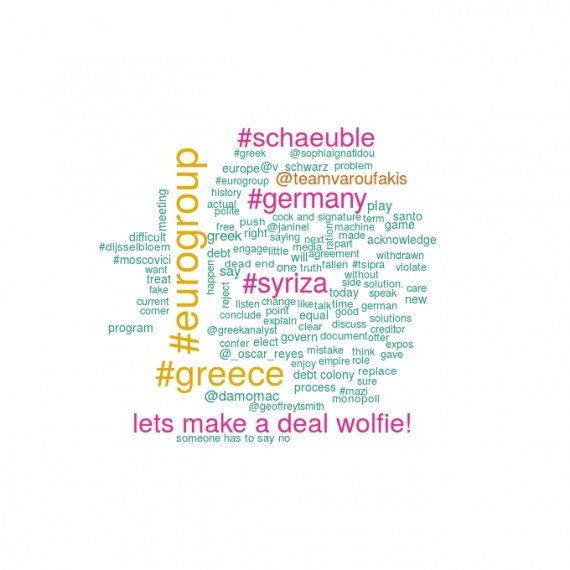 Από την άλλη πλευρά, στα αγγλικά tweets (διάγραμμα 2) η βαρύτητα δίνεται στην αντιπαράθεση Ελλάδας – Γερμανίας καθώς επίσης και στο πολύ δημοφιλές tweet που περιέχει τη φράση: Lets make a deal Wolfie. Οι αγγλόφωνοι δεν ασχολήθηκαν ιδιαίτερα με το έγγραφο Moscovici. Αντίθετα, υπάρχουν αναφορές στο “πρόγραμμα” (program) και το αδιέξοδο (dead-end) αλλά και στη monopoly και τα παιχνίδια (games) που κάποιοι υποστηρίζουν πως παίζει ο Βαρουφάκης.
