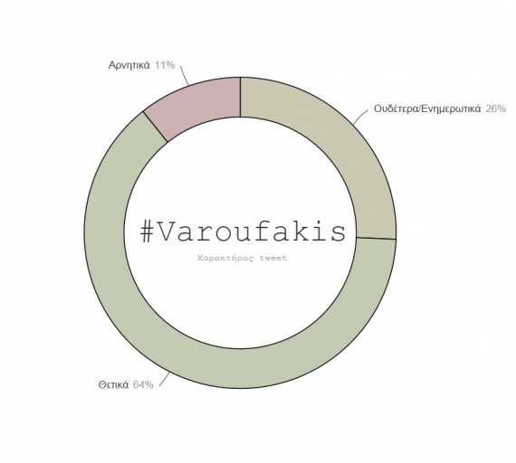 Περαιτέρω ανάλυση του περιεχομένου των tweets δείχνει την αποδοχή του Γ. Βαρουφάκη στο ελληνικό κοινό. Συνολικά, τα θετικά tweets για τον κ. Βαρουφάκη ήταν 64%, τα αρνητικά 11% και τα ουδέτερα/ενημερωτικά 26%.