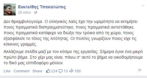 Με ένα μήνυμα στο Facebook Ευκλείδης Τσακαλώτος επιχείρησε μια πρώτη αποτίμηση της συμφωνίας στο Eurogroup.