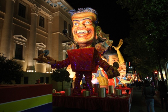Ειδικότερα το σατιρικό άρμα με θέμα «Εκλογές 2015» περιλαμβάνει το πολιτικό προσωπικό της επικαιρότητας, δηλαδή τον Αλέξη Τσίπρα, τον Αντώνη Σαμαρά και την Άγγελα Μέρκελ. Ειδικότερα υπάρχει η φιγούρα του Αντώνη Σαμαρά με τη μορφή χορεύτριας-χανούμισσας και η φιγούρα της 'Αγγελας Μέρκελ σε μικρό μέγεθος πάνω στο μπράτσο του, που τού ψιθυρίζει κάτι στο αυτί.
