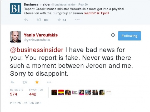 «Έχω άσχημα νέα για εσάς: το ρεπορτάζ σας είναι ψεύτικο» έγραψε στο twitter ο Γιάνης Βαρουφάκης απαντώντας στο Business Insider που είχε υποστηρίξει ότι Έλληνας υπουργός σχεδόν ήρθε στα χέρια με τον Ντάισελμπλουμ.