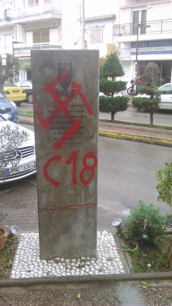 Οι άγνωστοι φασίστες, γέμισαν με σπρέι το μνημείο με αγκυλωτούς σταυρούς και την υπογραφή “C-18”. «Η νέα θρασύτατη πρόκληση και η επανεμφάνιση των φασιστοειδών στους δρόμους της πόλης μας αποδεικνύει ότι το μέτωπο αυτό παραμένει ανοιχτό.» τονίζει ο Δήμος Δραπετσώνας-Κερατσινίου, στην ιστοσελίδα του ενώ συμπληρώνει «Ο Δήμος μας καταδικάζει την άνανδρη φασιστική επίθεση στο σημείο της δολοφονίας, ένα χώρο με ιδιαίτερη συμβολική σημασία για εμάς, ένα χώρο μνήμης που θυμίζει στους κατοίκους της πόλης μας ότι ο αγώνας ενάντια στην απειλή του φασισμού πρέπει να είναι διαρκής στα σχολεία, στους χώρους δουλειάς και στις γειτονιές μας.»