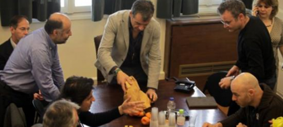 Κρατώντας μια χαρτοσακούλα με μανταρίνια εμφανίστηκε ο επικεφαλής του Ποταμιού, Σταύρος Θεοδωράκης, στη συνεδρίαση της ΚΟ του κόμματος.