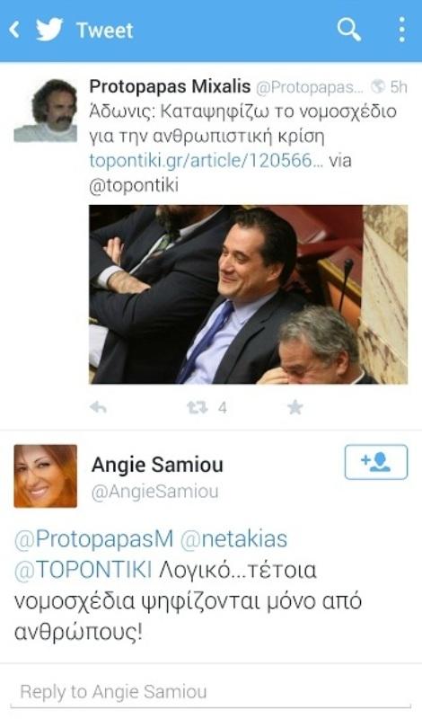 Την απόφαση του Άδωνι Γεωργιάδη να μην ψηφίσει το νομοσχέδιο για την ανθρωπιστική κρίση σχολίασε με σκωπτικό τρόπο στο twitter, η Άντζυ Σαμίου.