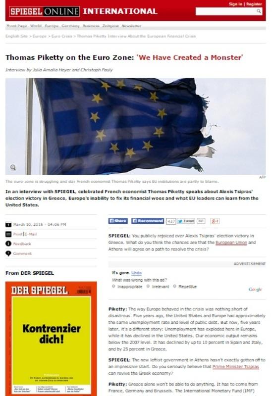 Σε συνέντευξή του στο γερμανικό περιοδικό Der Spiegel με τίτλο «Ο Τομάς Πικετί για την ευρωζώνη: Δημιουργήσαμε ένα τέρας» ο Γάλλος Οικονομολόγος Τομάς Πικετί, εκφράζει την άποψή του για «κοινοτικοποίηση» των χρεών των ευρωπαϊκών χωρών, με τη δημιουργία ενός ταμείου αποπληρωμής χρέους λέγοντας: «Οι Γερμανοί δεν θα έπρεπε να φοβούνται τη δημοκρατία. Αν έχουμε ένα κοινό νόμισμα, κάποια στιγμή θα πρέπει να αποδεχθούμε ότι θα πληρώνουμε επίσης χρήματα μαζί», δηλώνει