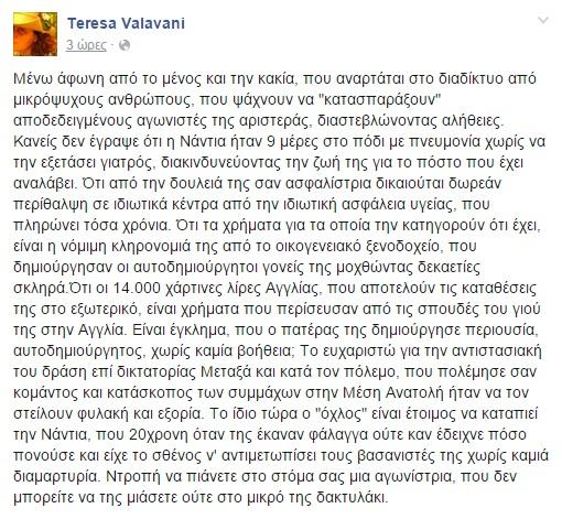 Όλη η ανάρτηση της Τερέζας Βαλαβάνη: