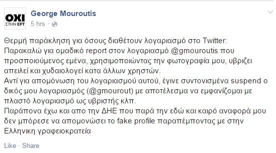 Ο στενός συνεργάτης του πρώην πρωθυπουργού Αντώνη Σαμαρά, μέσω facebook, κατηγόρησε εμμέσως τον ΣΥΡΙΖΑ και κατήγγειλε ότι δημιουργήθηκε άλλος λογαριασμός στο Twitter με το όνομά του, ο οποίος απειλεί και χυδαιολογεί.