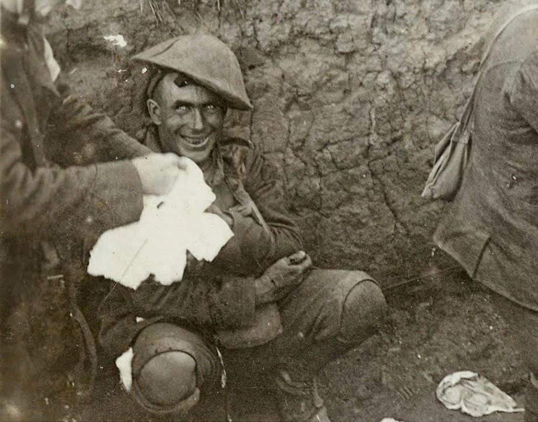 Ο στρατιώτης μοιάζει να έχει τρελαθεί από τι φρίκη γύρω του καθώς κάθε κοινωνικό συμβόλαιο που απαρτίζει τη ζωή του έχει γκρεμιστεί σε χιλιάδες κομμάτια. Το στιγμιότυπο είναι τυχαίο και ο οπλίτης δεν χαμογελά στο φακό.
