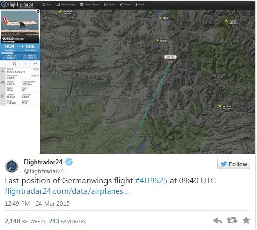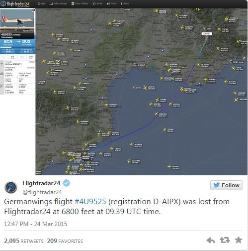 Το αεροσκάφος της Germanwings κατευθυνόταν από τη Βαρκελώνη στο Ντίσελντορφ όταν περίπου 46 λεπτά μετά την απογείωση του από το αεροδρόμιο της Βαρκελώνης και ενώ πετούσε πάνω από τις γαλλικές Άλπεις εξαφανίστηκε από τα ραντάρ.Σύμφωνα με πληροφορίες έπεφτε επί 8 λεπτά από τα 38 χιλιάδες πόδια στα 6 χιλιάδες πόδια.
