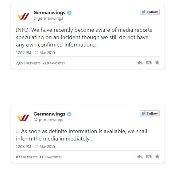 Εντυπωσιακό είναι πως η αεροπορική εταιρεία Germanwings θυγατρική της Lufthansa, παρόλη τη δημοσιότητα στα πρώτα λεπτά του συστυχήαμτος, με αναρτήσεις στο λογαριασμό του Τwitter της εταιρείας, ανέφερε πως δεν επιβεβαιώνει τίποτα.