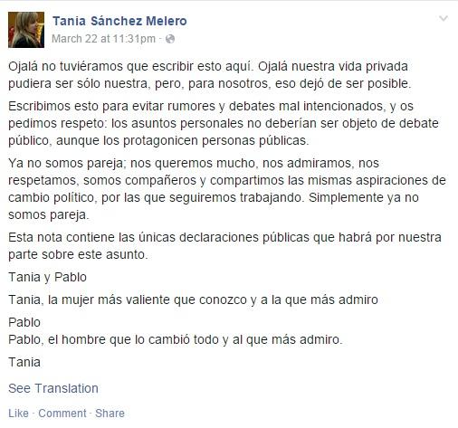 «Αγαπιόμαστε, θαυμάζουμε και σεβόμαστε ο ένας τον άλλο, και έχουμε τις ίδιες φιλοδοξίες για πολιτική αλλαγή στην Ισπανία. Απλά δεν είμαστε πια ζευγάρι» έγραψε στο προφίλ του ο ηγέτης των Podemos. Αντίστοιχο post έκανε και η πρώην πια σύντροφός του Τάνια Σάντσεζ.