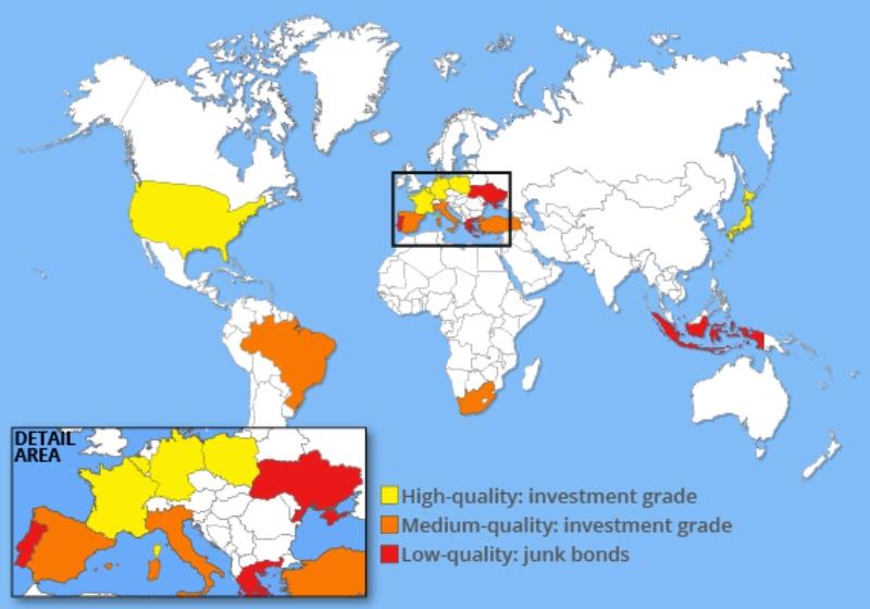 Στη μέση ζώνη «κινδύνου» είναι η Ιταλία και η Ισπανία, ενώ στα «κόκκινα» είναι Ελλάδα και Πορτογαλία, τα ομόλογα των οποίων ανήκουν στην κατηγορία junks δηλαδή «σκουπίδια».
