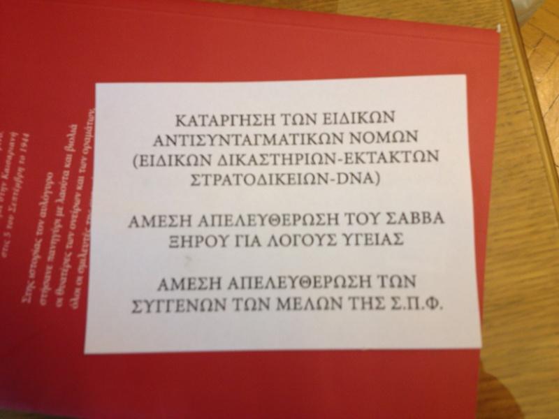Οι συγκεντρωμένοι άνοιξαν πανό συμπαράστασης στους φυλακισμένους, στο περιστύλιο της Βουλής, όπου και παρέμειναν περίπου 15 λεπτά.
