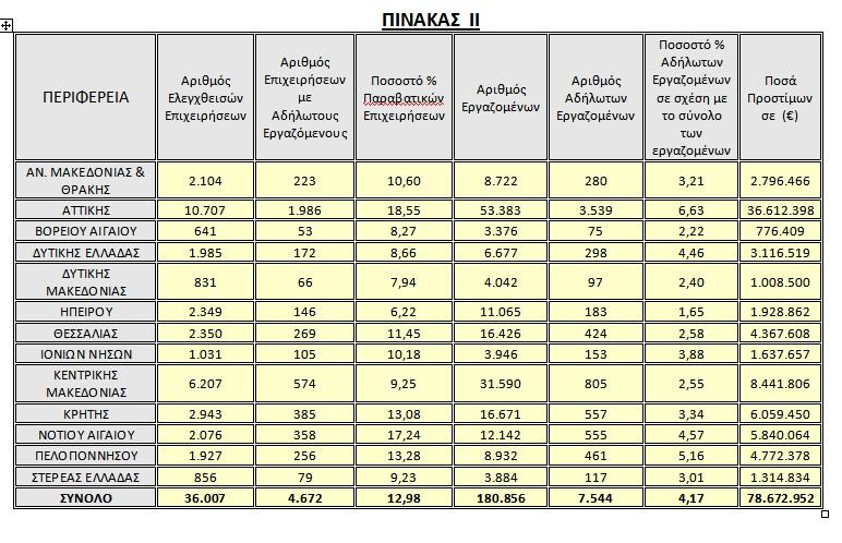 Σε σύνολο 180.856 εργαζομένων στις επιχειρήσεις που διενεργήθηκαν έλεγχοι, εντοπίστηκαν 7.544 αδήλωτοι εργαζόμενοι (ποσοστό 4,17%), ενώ τα πρόστιμα που επιβλήθηκαν, αποκλειστικά για την αδήλωτη εργασία ανέρχονται στο ποσό των 78.672.952 €.