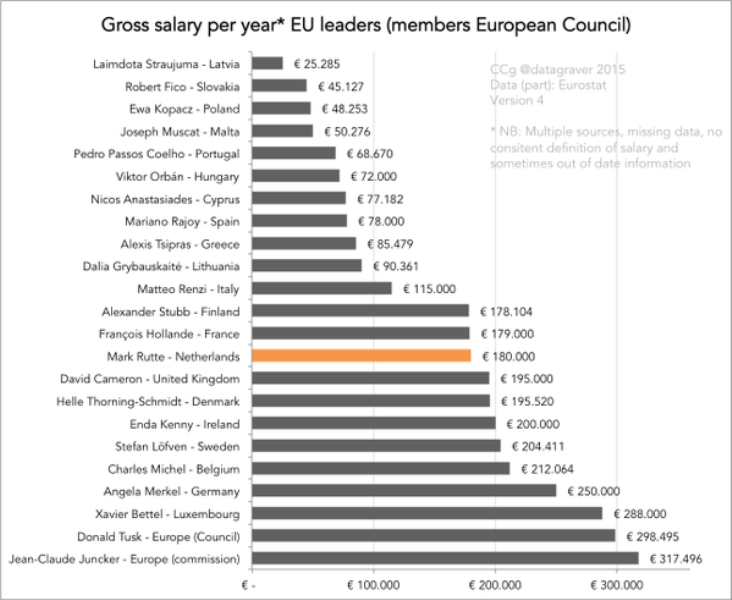 Πιο ακριβοπληρωμένοι είναι ο Ζ. Γιούνκερ, ο Ντ. Τουσκ, ο Ξ. Μπετέλ (πρωθυπουργός Λουξεμβούργου) και η Α. Μέρκελ. Ο Αλέξης Τσίπρας με 85.479 ευρώ μισθό το χρόνο βρίσκεται στην 15η θέση.