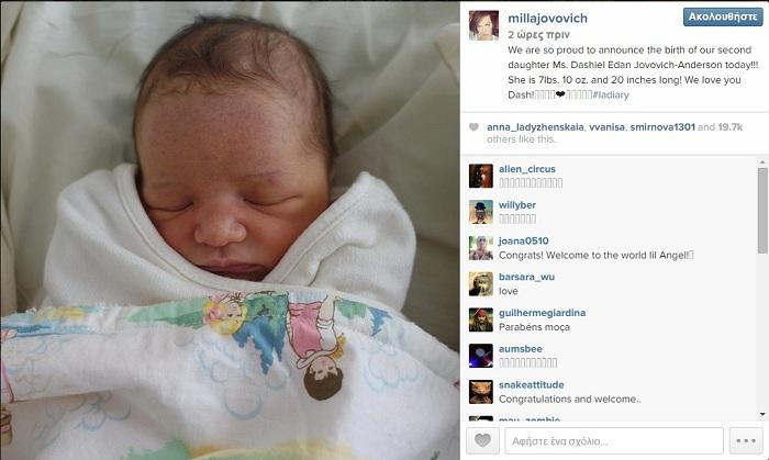 Η αμερικανίδα ηθοποιός Μίλα Γιόβοβιτς έφερε στον κόσμο σε μαιευτήριο του Λος Άντζελες τη δεύτερη κόρη της Ντάσιελ Έντον, που απέκτησε με τον βρετανό σκηνοθέτη και παραγωγό Πολ Άντερσον.