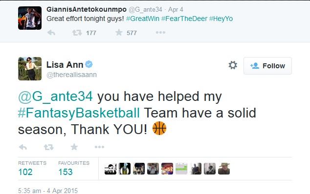 «Σπουδαία προσπάθεια παιδιά! #σπουδαία νίκη», έγραψε ο Αντετοκούνμπο και η Lisa Ann του απάντησε «Γιάννη, βοήθησες την ομάδα μου στο Fantasy. Η ομάδα κάνει καλή σεζόν. Σε ευχαριστώ», έγραψε η 42χρονη πορνοστάρ, που πρόσφατα αποφάσισε να αποσυρθεί από την ενεργό δράση και πλέον θα βρίσκεται πίσω από τις κάμερες, ως παραγωγός ή σκηνοθέτης.
