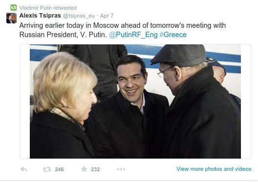 Ο Ρώσος πρόεδρος Βλαντιμίρ Πούτιν υποδέχτηκε θερμά εκτός από τον ίδιο τον Έλληνα πρωθυπουργό Αλέξη Τσίπρα, και τις αναρτήσεις του στο twitter.