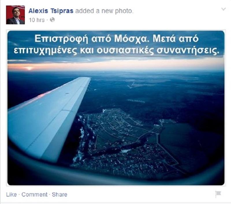 Μία φωτογραφία μέσα από το αεροπλάνο, που τραβήχτηκε κατά την διάρκεια της επιστροφής της ελληνικής αποστολής στην Αθήνα από τη Ρωσία ανέβασε στο Facebook ο Αλέξης Τσίπρας