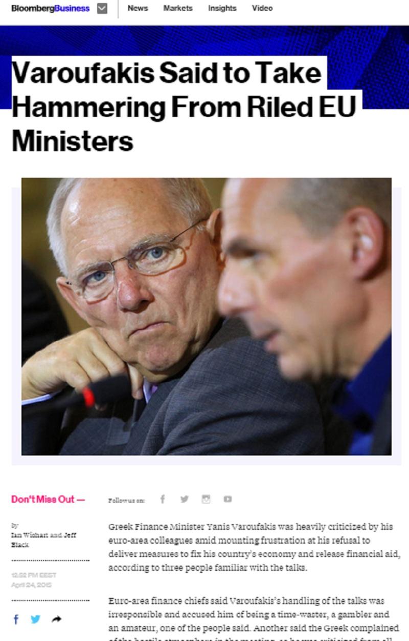 Το δημοσιεύμα αναφέρει ότι «ο Γιάνης Βαρουφάκης δέχθηκε σφοδρή κριτική από τους ευρωπαίους ομολόγους του εν μέσω της αυξανόμενης δυσφορίας για την άρνησή του να παρουσιάσει μέτρα που θα διορθώσουν την οικονομία της χώρας του ώστε να υπάρξει απελεύθερωση των δόσεων, σύμφωνα με τρεις πηγές που έχουν γνώση των συνομιλιών. Πηγές από την Ευρωζώνη λένε ότι οι χειρισμοί Βαρουφάκη για τις συνομιλίες ήταν ανεύθυνοι, τον κατηγόρησαν για χρονοτριβή, για τζογαδόρο και ερασιτέχνη».
