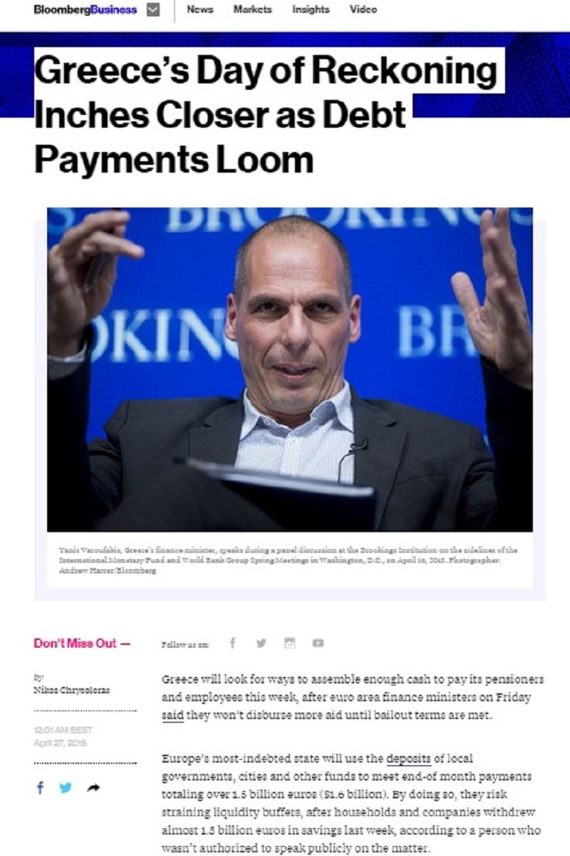 «Η Ελλάδα θα αναζητήσει τρόπους για να συγκεντρώσει χρήματα, ώστε να πληρώσει τους συνταξιούχους και τους υπαλλήλους της αυτή την εβδομάδα, αφού οι υπουργοί Οικονομικών της ζώνης του ευρώ την Παρασκευή, δήλωσαν ότι δεν πρόκειται να καταβάλουν περισσότερη βοήθεια μέχρι να εκπληρωθούν οι όροι διάσωσης», αναφέρει.