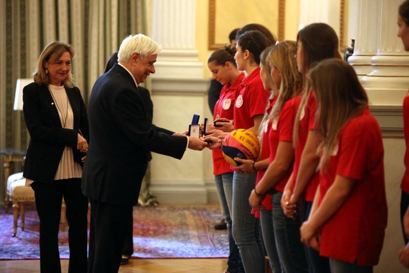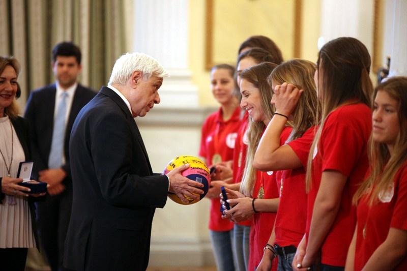 Ο Πρόεδρος της Δημοκρατίας συνεχάρη θερμά τις πολίστριες του Ολυμπιακού για τη μεγάλη τους επιτυχία και τους προσέφερε αναμνηστικό με το Εθνόσημο της Προεδρίας.