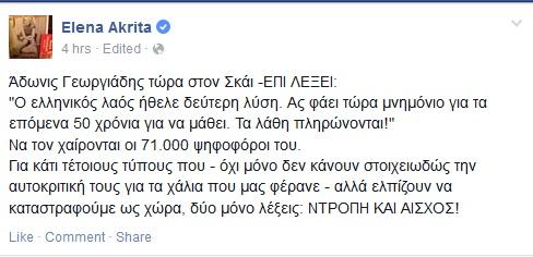 Επίθεση μέσω του προσωπικού της λογαριασμού στο Facebook εξαπέλυσε η Έλενα Ακρίτα στον Άδωνι Γεωργιάδη με αφορμή δήλωση που έκανε ο βουλευτής της ΝΔ σε τηλεοπτική εκπομπή.